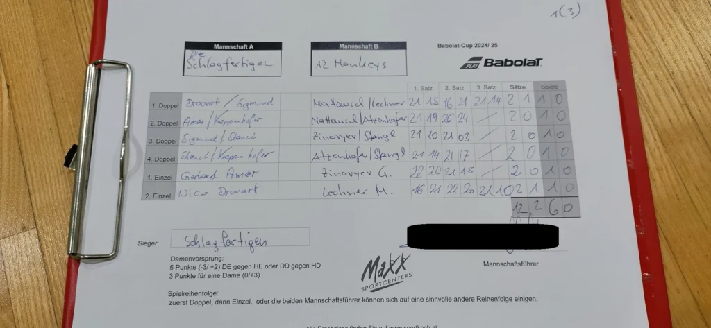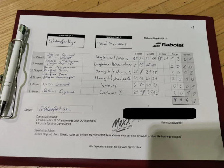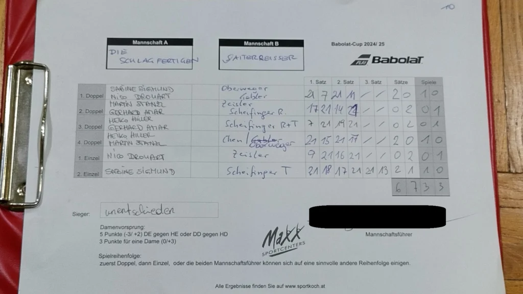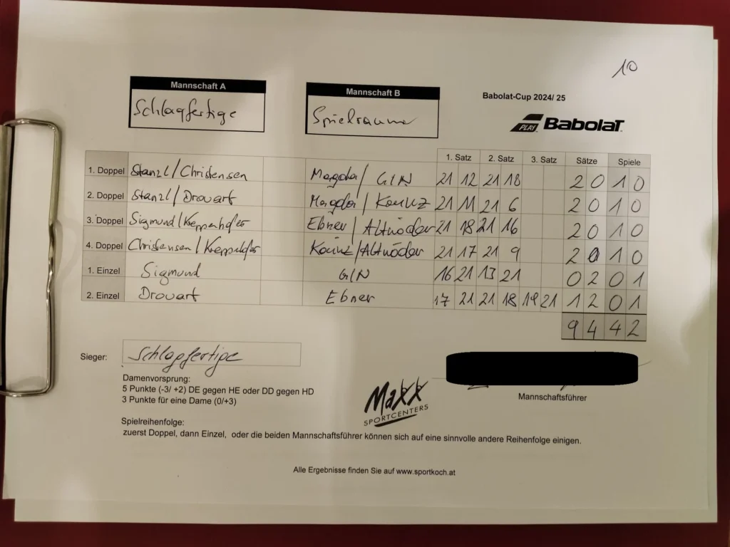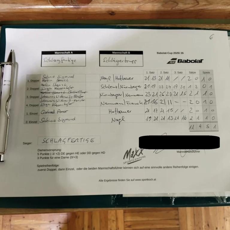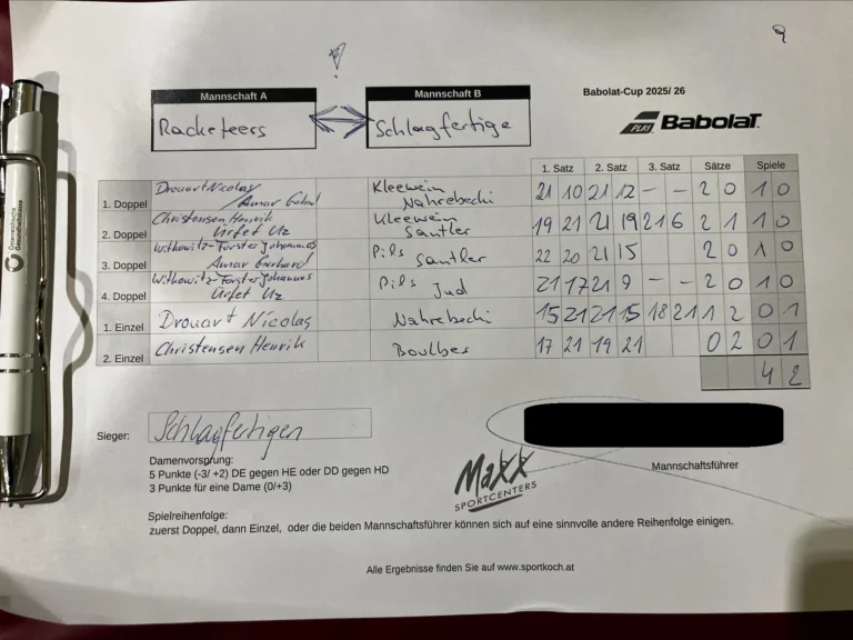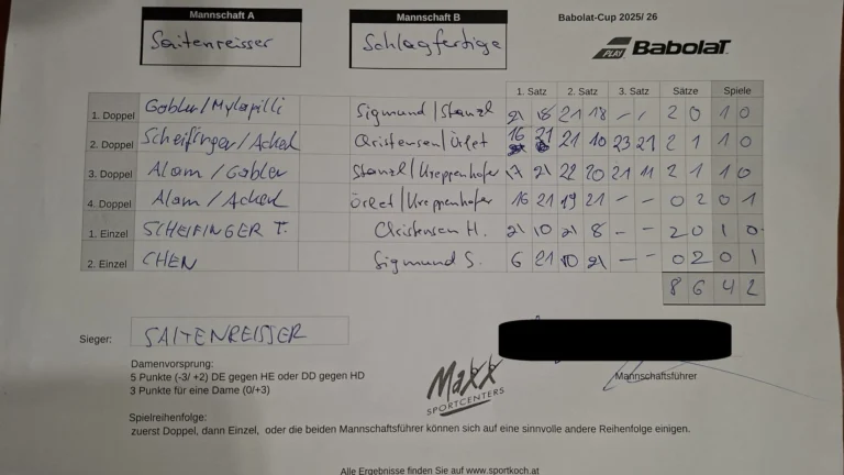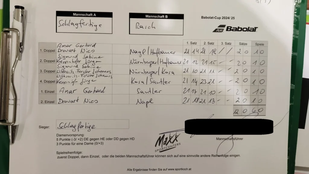 Seit 2023 spielen wir als „Die Schlagfertigen“ beim Babolat-Cup, einer Turnierserie, welche von Harald Koch im MaXX-Sportcenter ausgetragen wird, mit. Die Tabelle der laufenden Saison ist HIER ersichtlich.